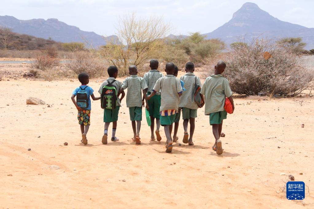 8月26日,在遭受旱灾的肯尼亚马萨比特郡莱萨米斯镇,孩子们放学回家。他们从学校回家需要步行5公里。