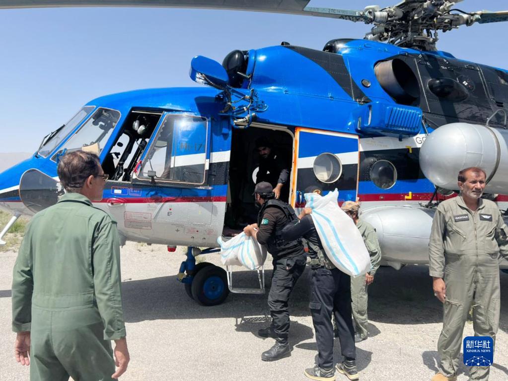 8月28日,在巴基斯坦俾路支省贾法拉巴德地区,人们从直升机上卸下救灾物资。