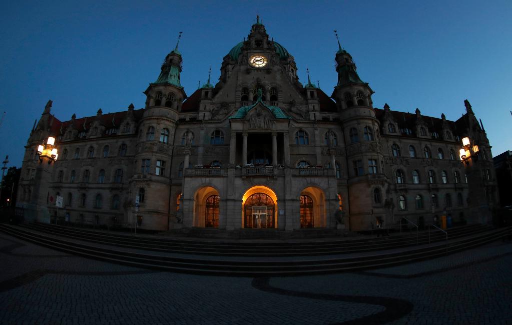 这是8月1日晚拍摄的德国汉诺威市政厅。为应对能源紧张,德国多地采取措施节约用电。新华社发(约阿希姆·谢尔斯基摄)