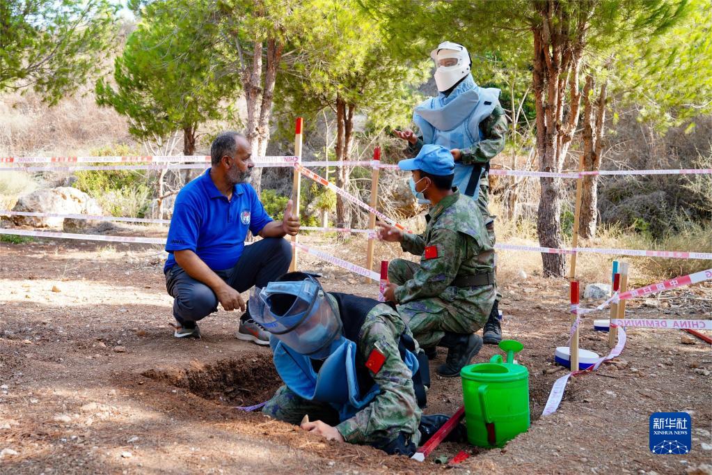 8月29日,在黎巴嫩南部辛尼亚村扫雷训练场,考官对扫雷作业手挖掘作业表示肯定。