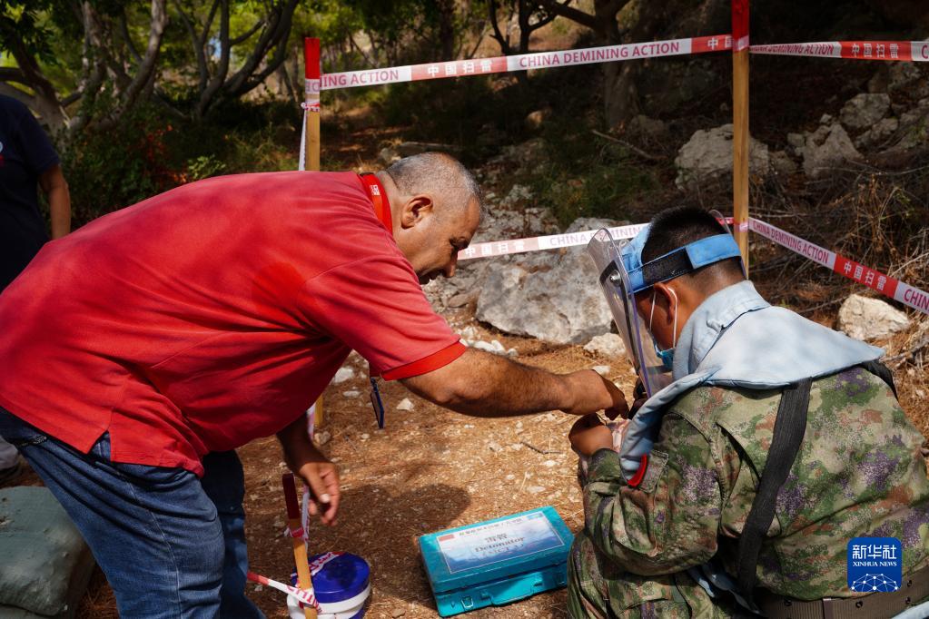 8月30日,在黎巴嫩南部辛尼亚村扫雷训练场,考官在销毁作业中检查排爆手作业效果。