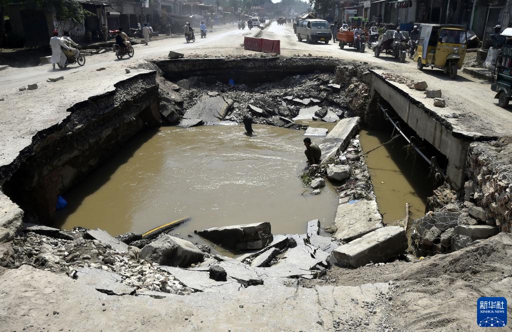 8月31日,在巴基斯坦西北部开伯尔-普什图省的贾尔瑟达地区,一段公路在洪水中被损毁。