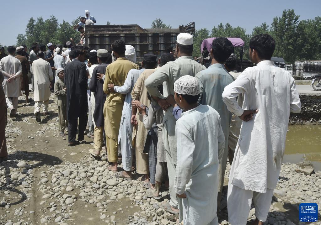 8月31日,在巴基斯坦西北部开伯尔-普什图省的贾尔瑟达地区,人们排队领取救灾物资。
