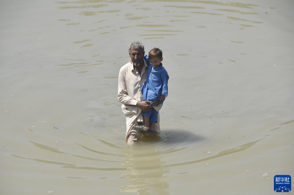 8月31日,在巴基斯坦西北部开伯尔-普什图省的贾尔瑟达地区,一名老人抱着孩子走在洪水中。
