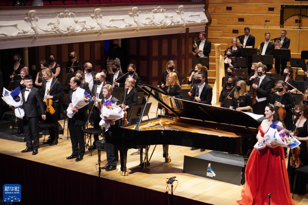 9月1日,在新西兰奥克兰市政厅,艺术家在“中华风韵”交响音乐会演出结束后谢幕。