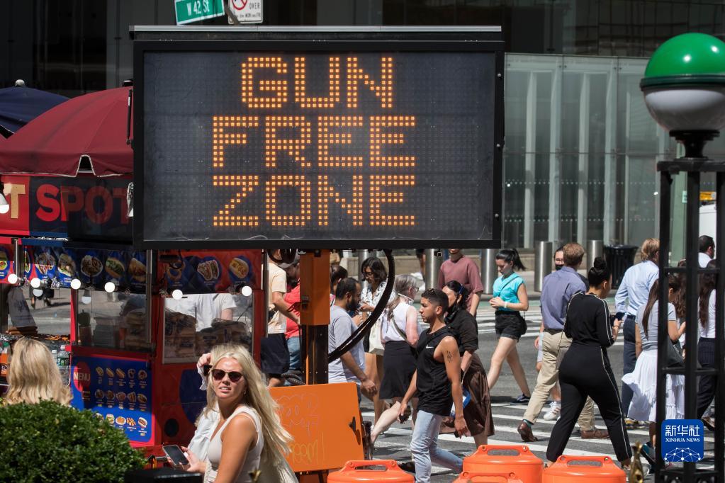 9月1日,人们从美国纽约时报广场邻近街区的“禁枪区”标志牌旁走过。