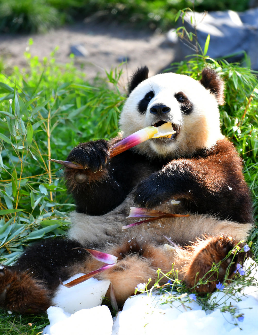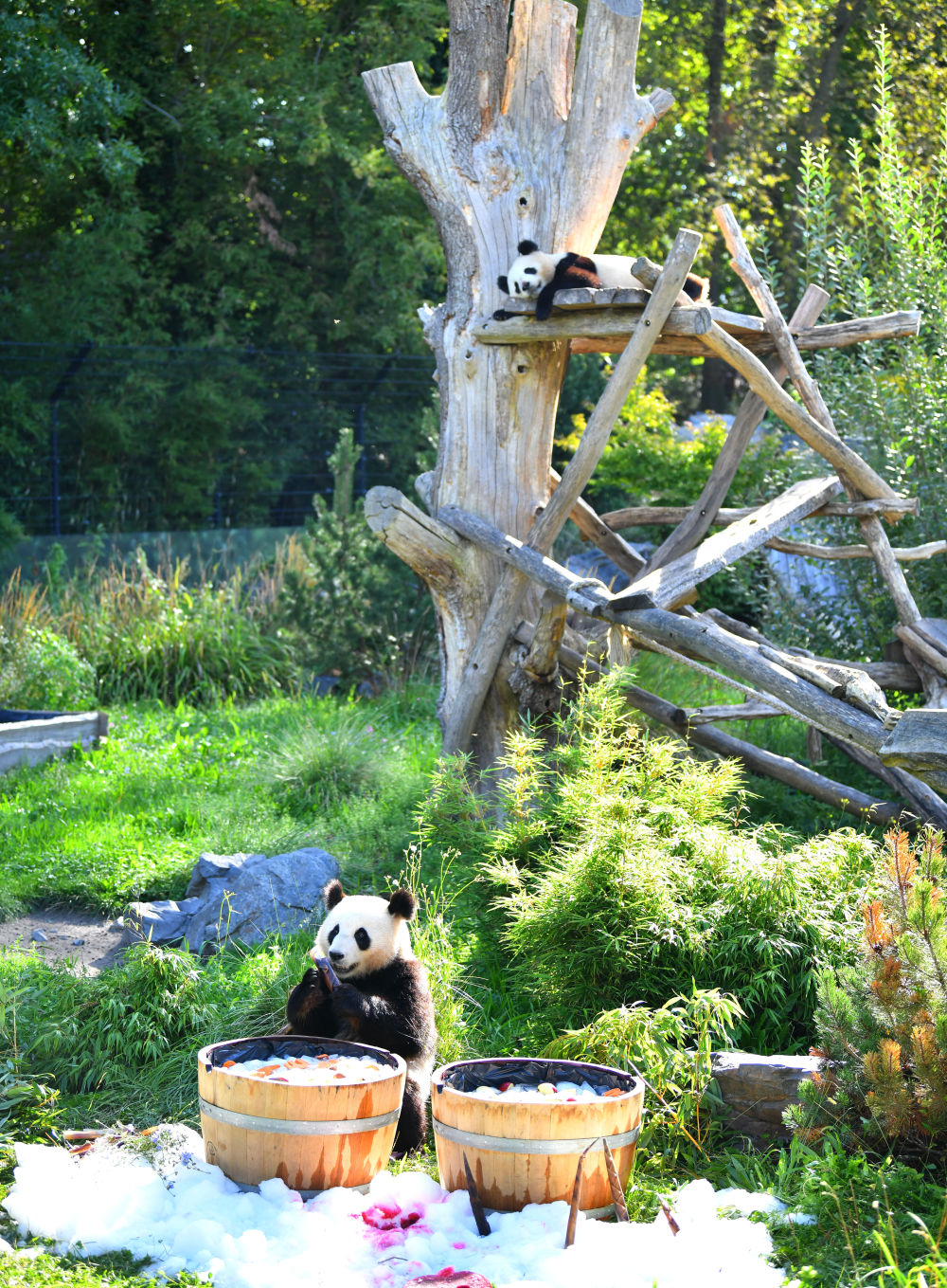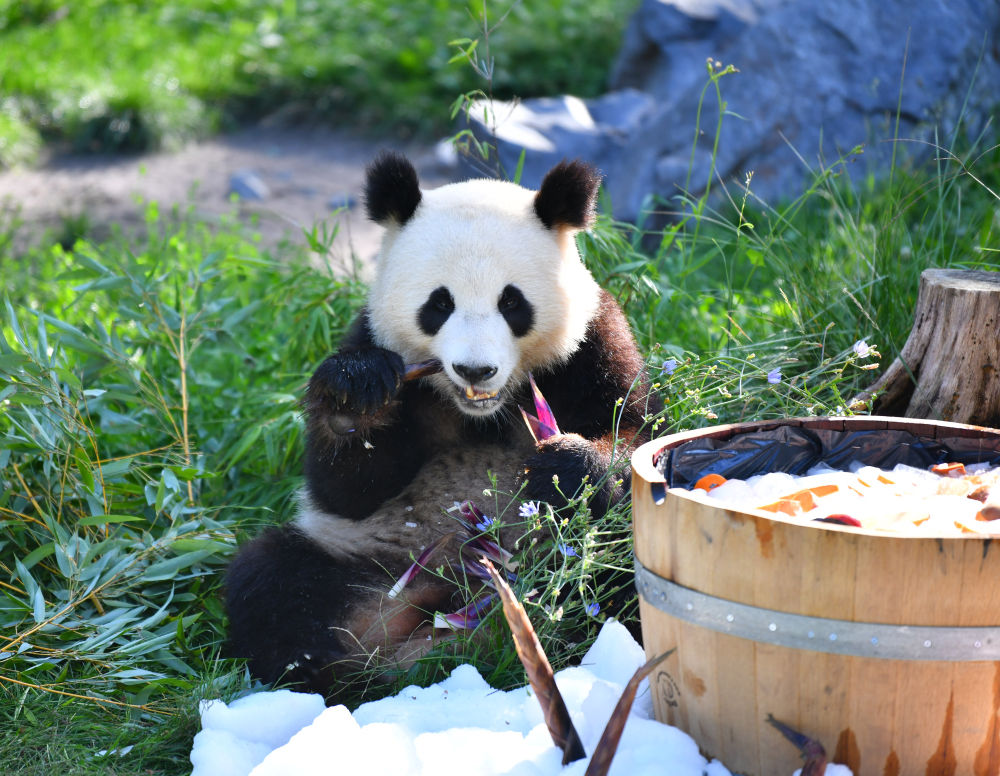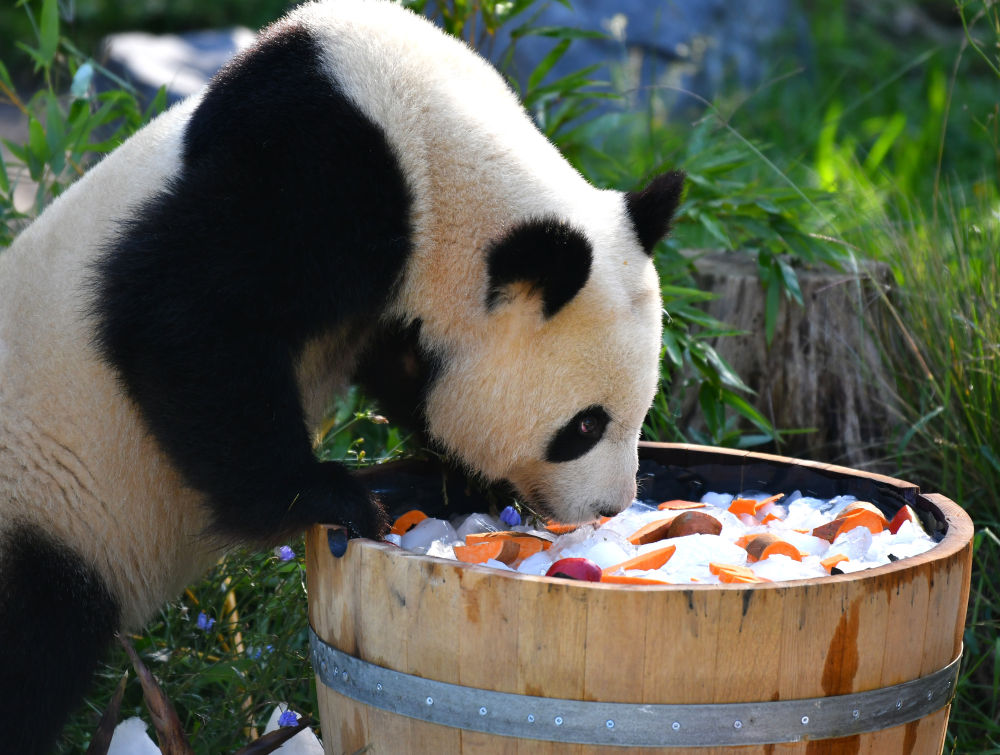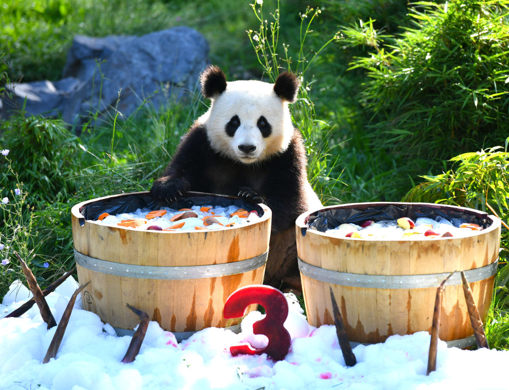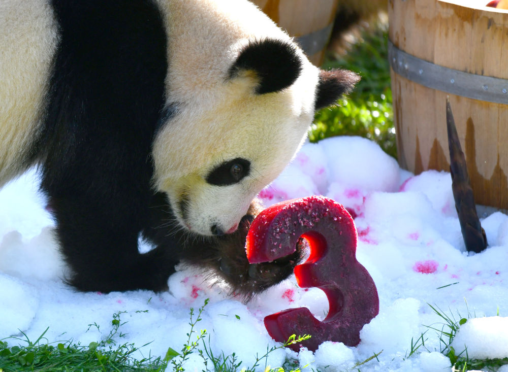 当天,园方特意为大熊猫双胞胎准备了“生日桶”,桶内盛满冰块,上面铺着切好的苹果和红薯块。桶前的碎冰堆上插着特意从中国订购的竹笋,红菜根汁冻成的数字“3”摆放在中央。