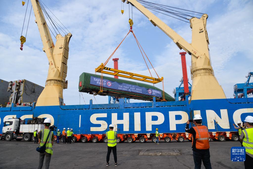 9月2日,在印度尼西亚雅加达丹戎不碌港举行的运抵仪式上,雅万高铁高速动车组在港口卸船。