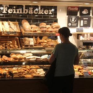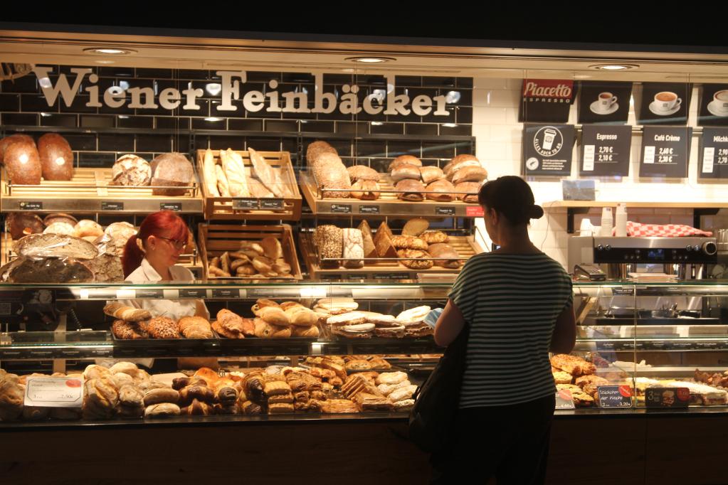 8月2日,顾客在德国法兰克福的一家面包店购买食品。(新华社记者单玮怡摄)