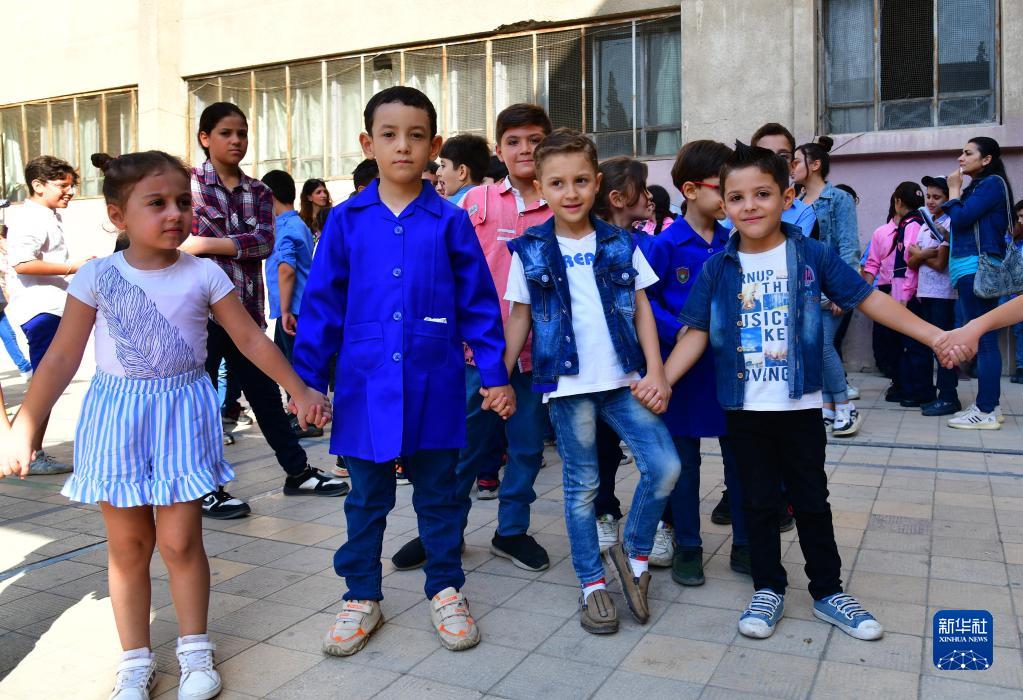 9月4日,叙利亚大马士革一所学校的学生站在校园里。