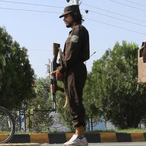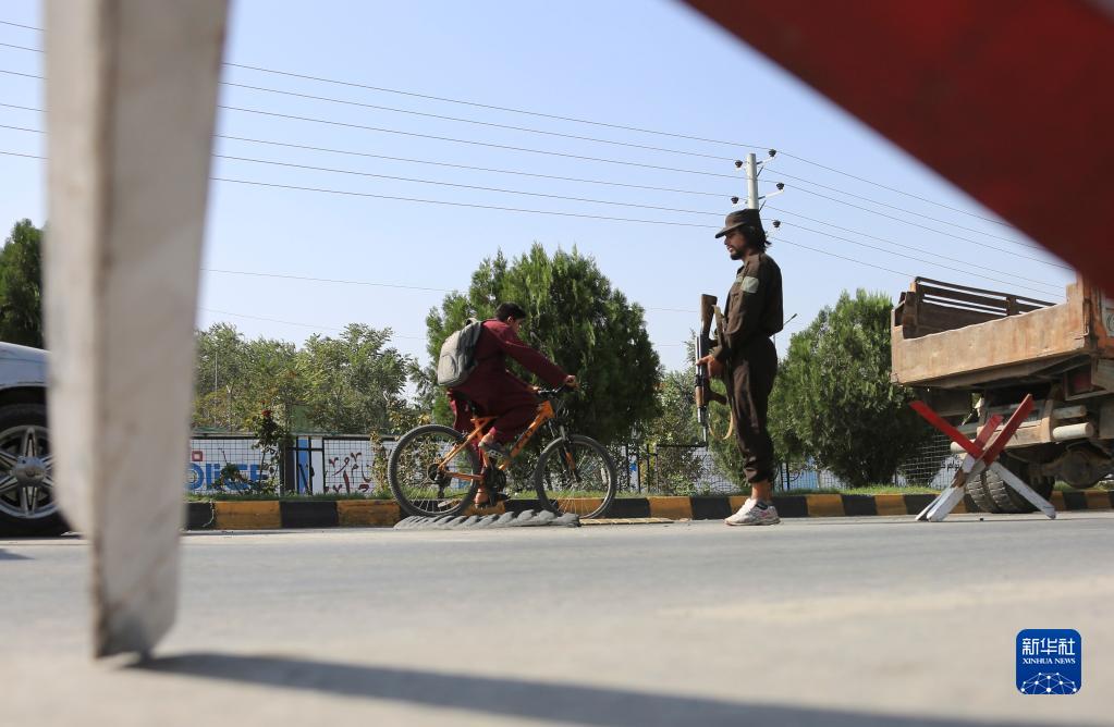 9月5日,阿富汗安全人员在喀布尔爆炸现场附近警戒。