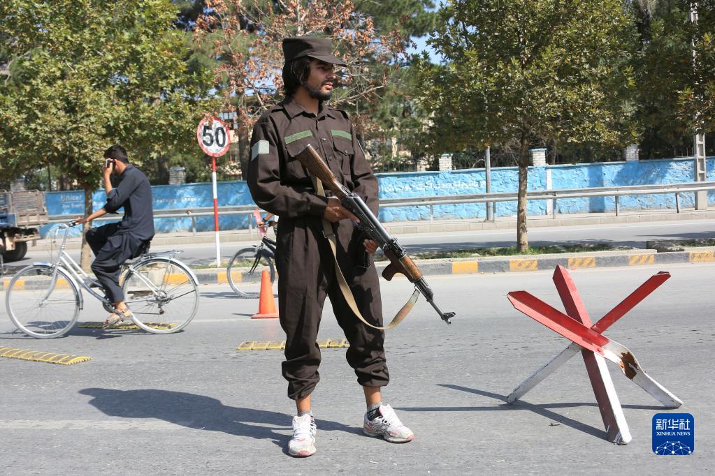 9月5日,阿富汗安全人员在喀布尔爆炸现场附近警戒。