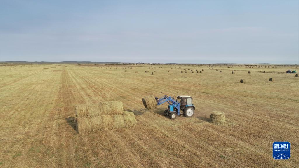 哈萨克斯坦北部地区9月进入牧草集中收割的季节,成片的牧草被牧民收割、晒干并捆成草垛,以备牲畜在冬季食用。新华社发(奥斯帕诺夫摄)