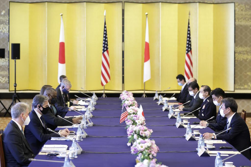 2021年3月16日,访问日本的美国国务卿安东尼·布林肯(左二)和国防部长劳埃德·奥斯汀(左三)与日本外务大臣茂木敏充(右一)和防卫大臣岸信夫(右二)一同在日本在东京出席“2+2”会谈。新华社发(Pool图片,太田洁摄)