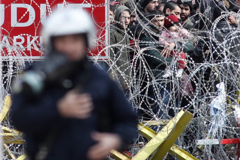 2020年3月2日,在希腊东北部奥雷斯蒂亚达地区的卡斯塔尼斯边境口岸附近,大批难民和非法移民聚集在土耳其一侧。新华社发(迪米特斯·托斯迪斯摄)
