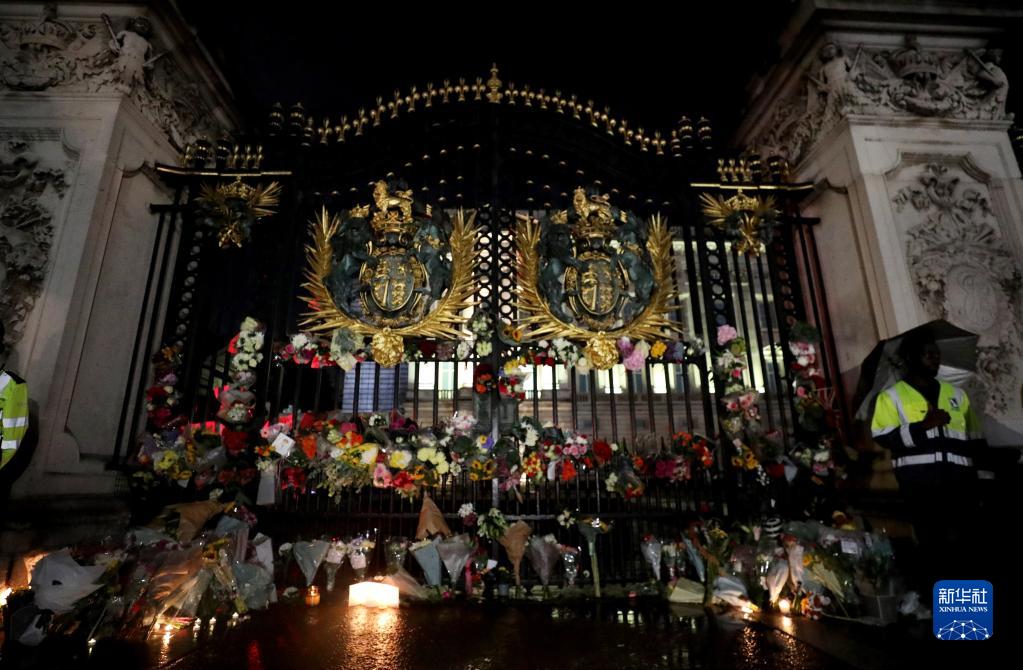 这是9月8日在英国伦敦的白金汉宫外拍摄的鲜花和蜡烛。