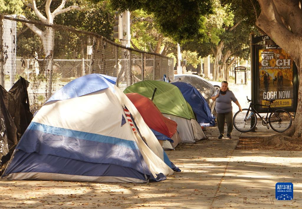 9月8日,行人在美国加利福尼亚州洛杉矶市区经过无家可归者的帐篷。