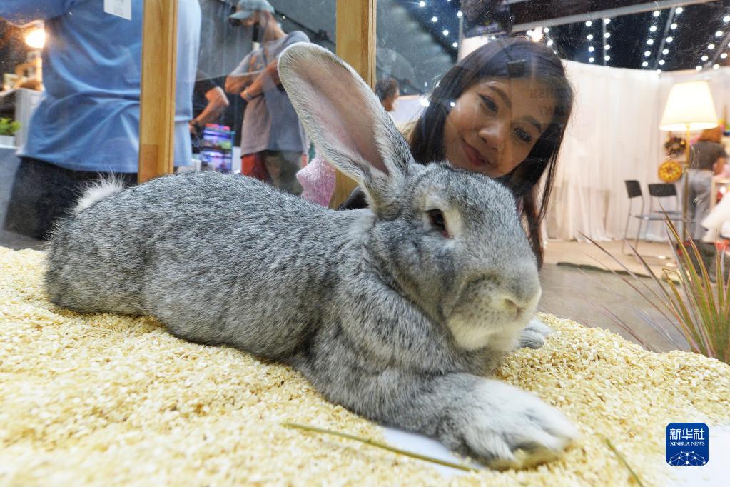 9月8日,观众在泰国曼谷举行的宠物博览会上观看一只巨型花明兔。