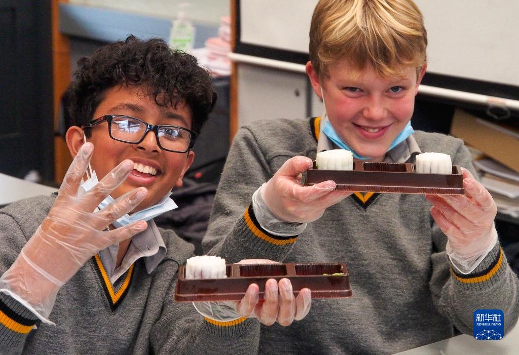 9月5日,在新西兰惠灵顿男子中学,参加中文课堂的学生制作冰皮月饼。