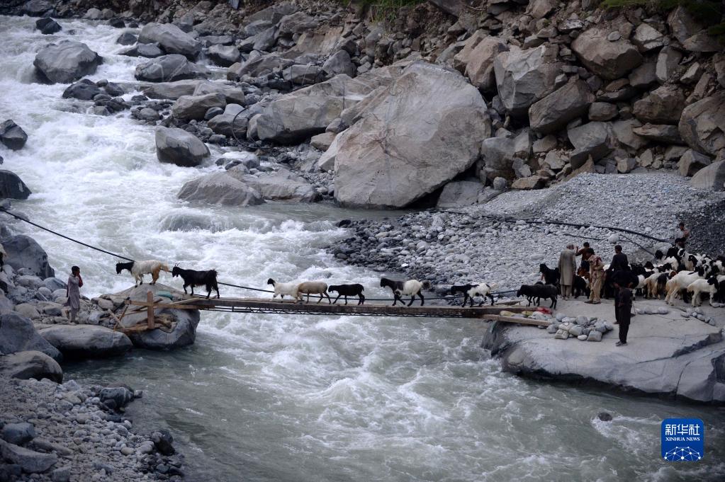9月1日,在巴基斯坦开伯尔-普什图省斯瓦特地区,人们驱赶牲畜从洪水过后临时搭建的小桥上跨过湍急的山涧溪流。