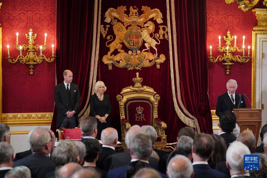 英国登基委员会10日在位于伦敦的圣詹姆斯宫正式宣告查尔斯三世为英国君主。这是查尔斯三世(右)在仪式上。新华社/美联