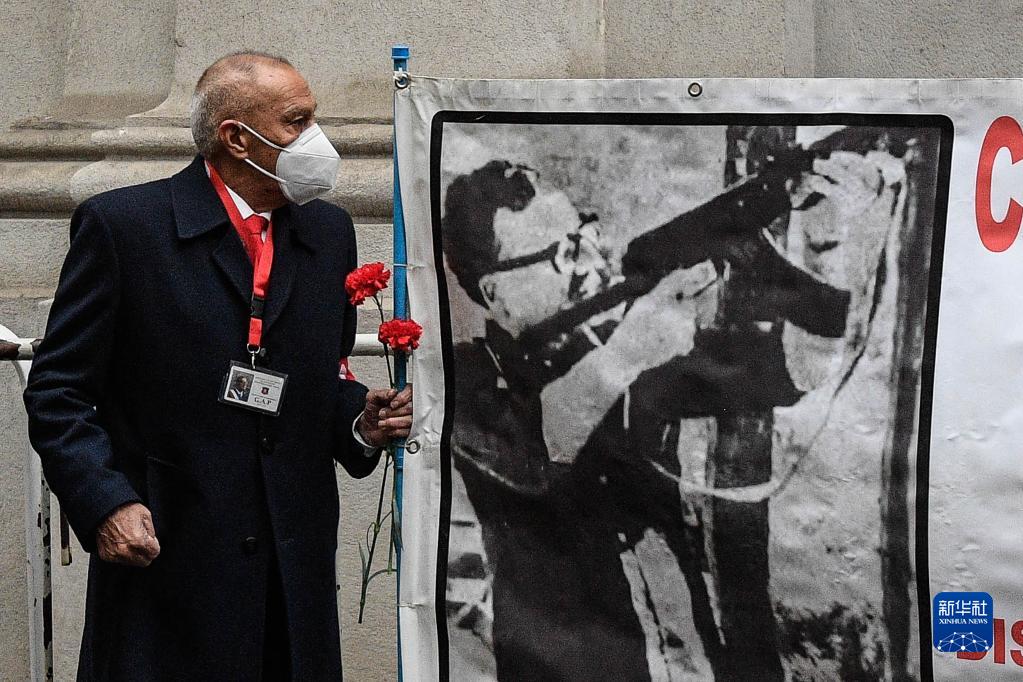 9月11日,在智利首都圣地亚哥,一名男士手执红色康乃馨纪念前总统阿连德遇难49周年。