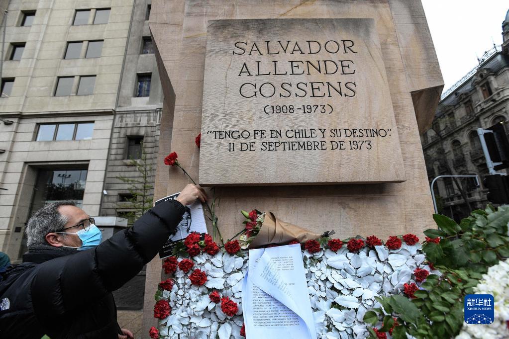 9月11日,在智利首都圣地亚哥,民众在前总统阿连德雕像前献花,纪念他遇难49周年。