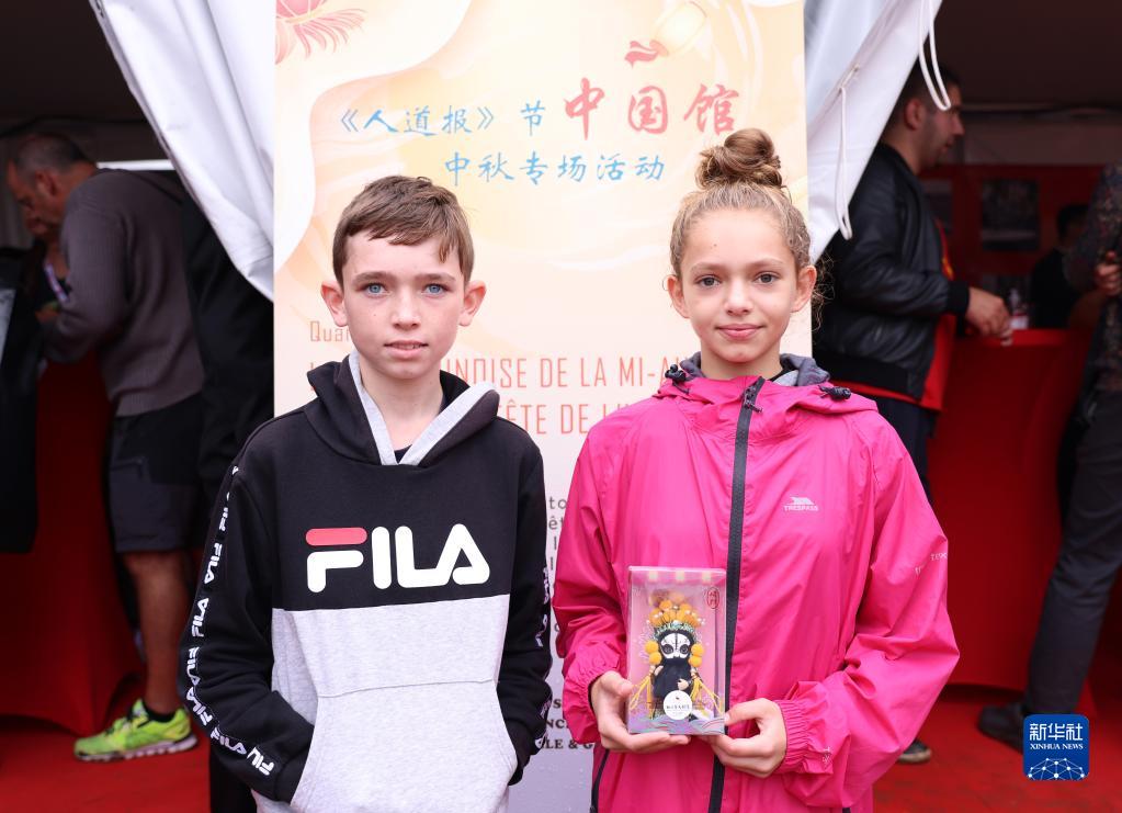 9月10日,在法国巴黎近郊举办的法国共产党《人道报》节上,两名法国小朋友在中国馆外与义卖的戏曲人物泥塑合影。