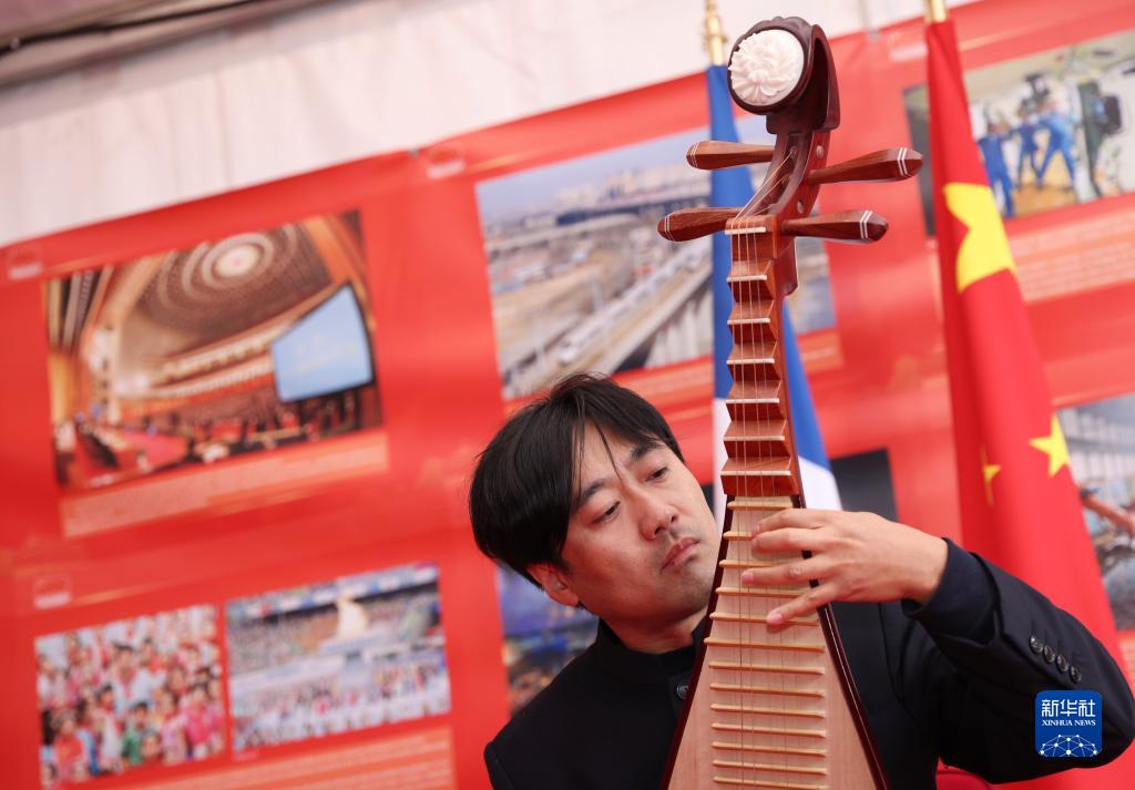 9月10日,在法国巴黎近郊举办的法国共产党《人道报》节上,艺术家在中国馆中秋专场活动上演奏琵琶。