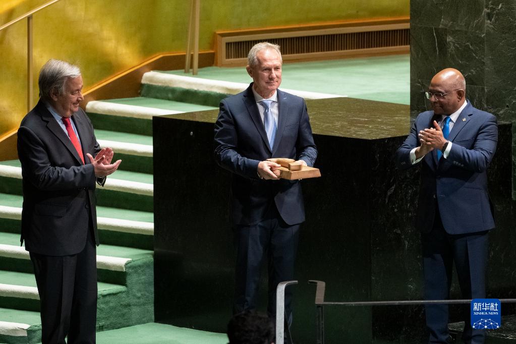 9月12日,在位于纽约的联合国总部,第77届联合国大会主席克勒希(中)从上届联大主席沙希德(右)手中接过象征联大主席权力的木槌。