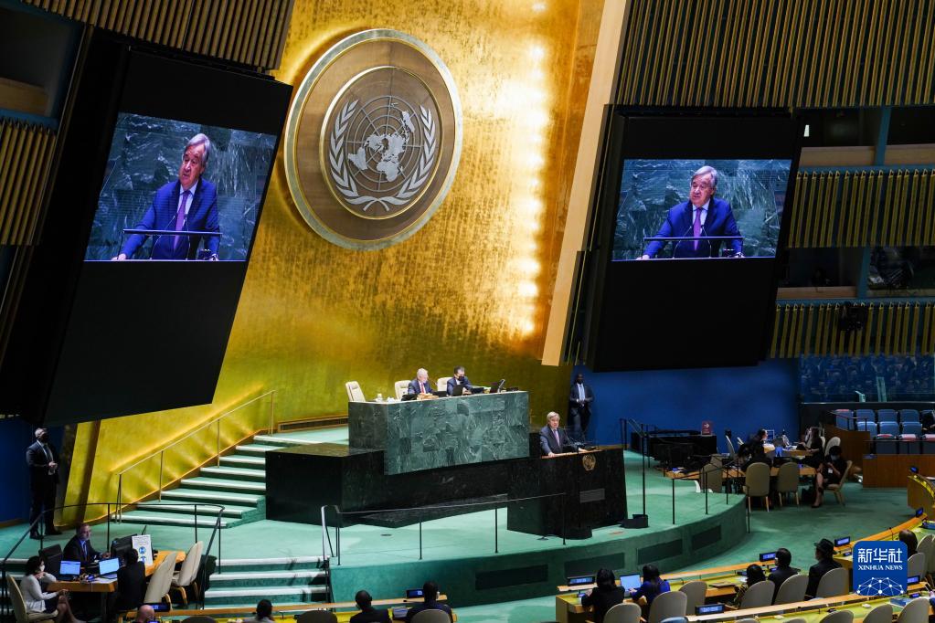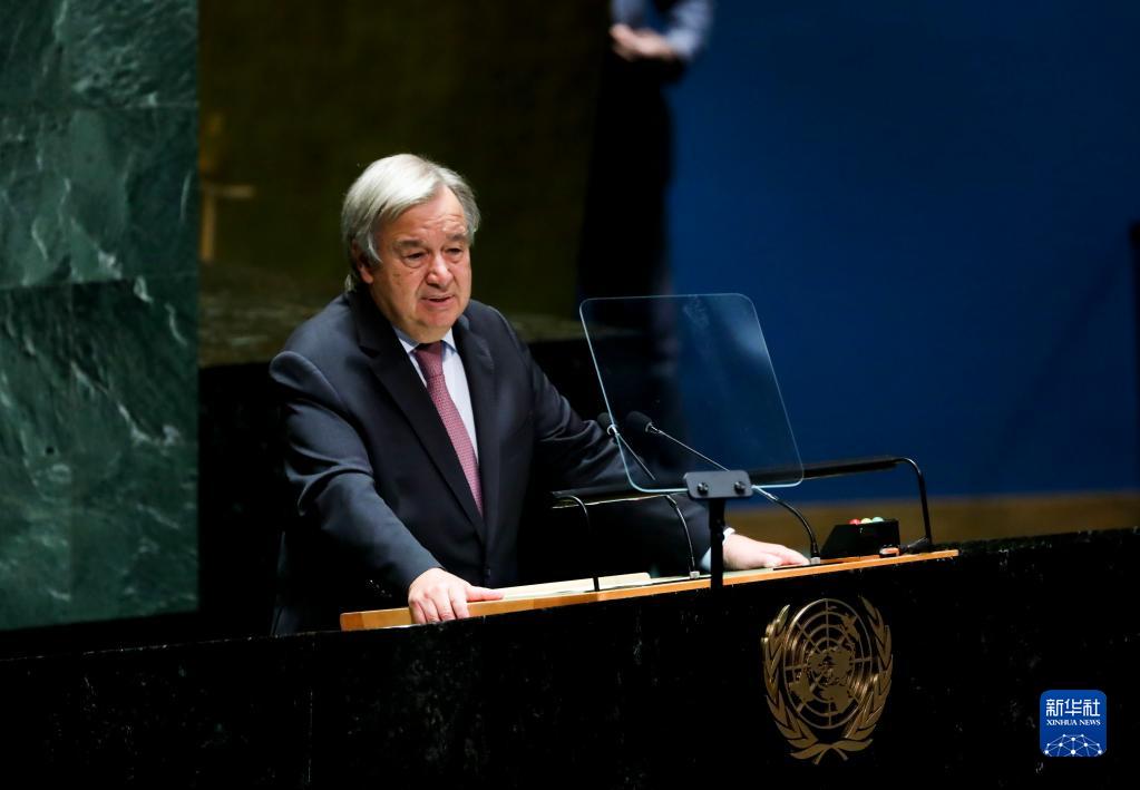 9月13日,在位于纽约的联合国总部,联合国秘书长古特雷斯在第77届联合国大会第一次全会上致辞。新华社记者 王迎 摄