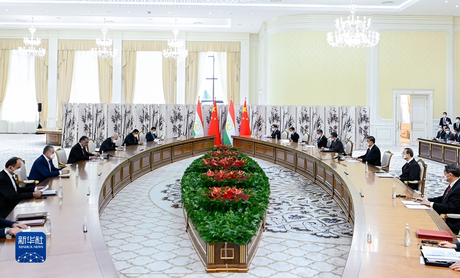 当地时间9月15日上午,国家主席习近平在撒马尔罕国宾馆会见塔吉克斯坦总统拉赫蒙。新华社记者 翟健岚 摄