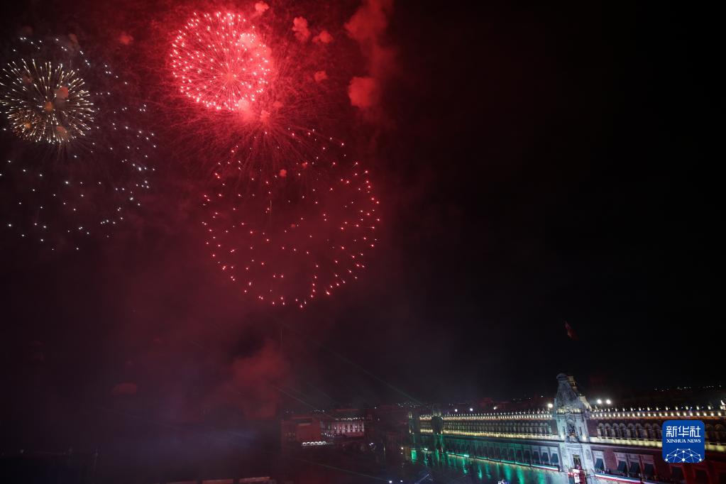 这是9月15日晚在墨西哥首都墨西哥城拍摄的庆祝独立日的烟花表演。