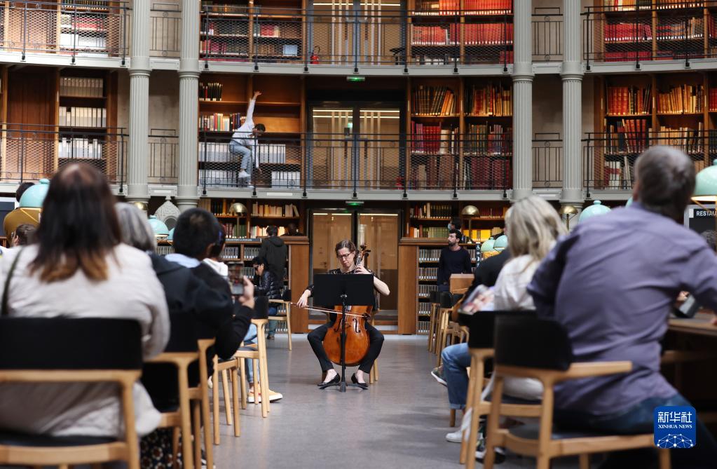 9月17日,在位于巴黎的法国国家图书馆黎塞留馆,人们在“椭圆大厅”聆听大提琴家的表演。