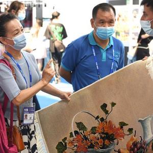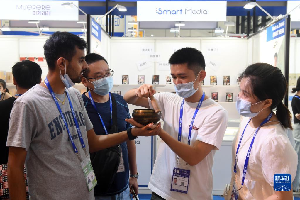 9月18日,观众在东博会“一带一路”国际展区体验来自尼泊尔的商品。