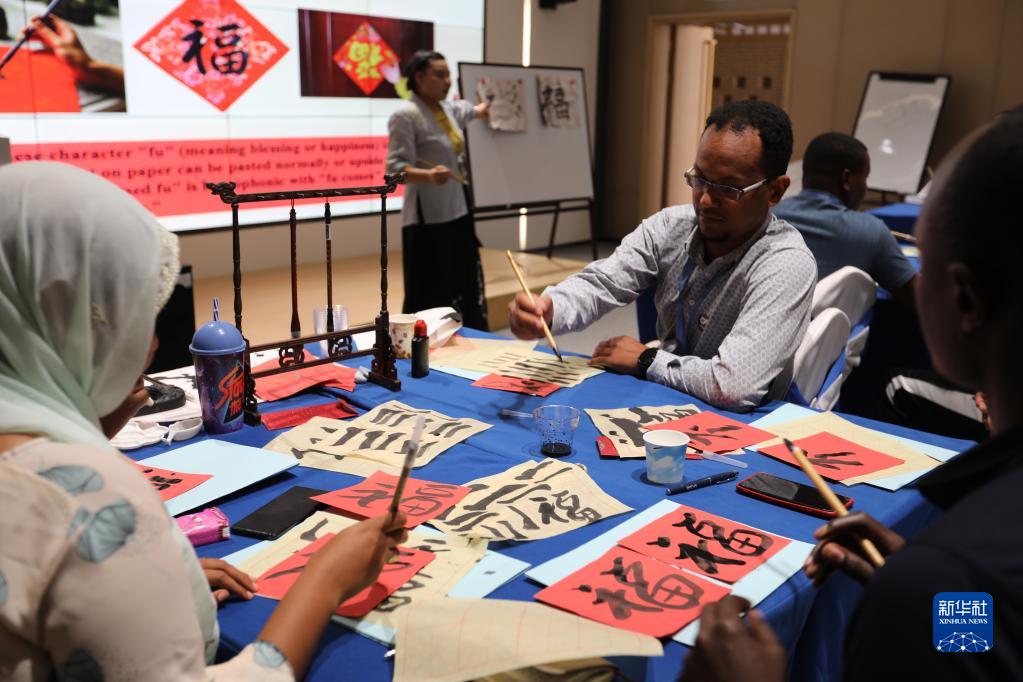 当日,在吉布提非洲青年创新创业中心,吉布提孔子学院老师为来自吉布提、埃赛俄比亚、肯尼亚、乌干达的非洲创业青年上了一堂生动的中国文化课。风俗、书法、剪纸等中国文化引起了学员们的广泛兴趣。