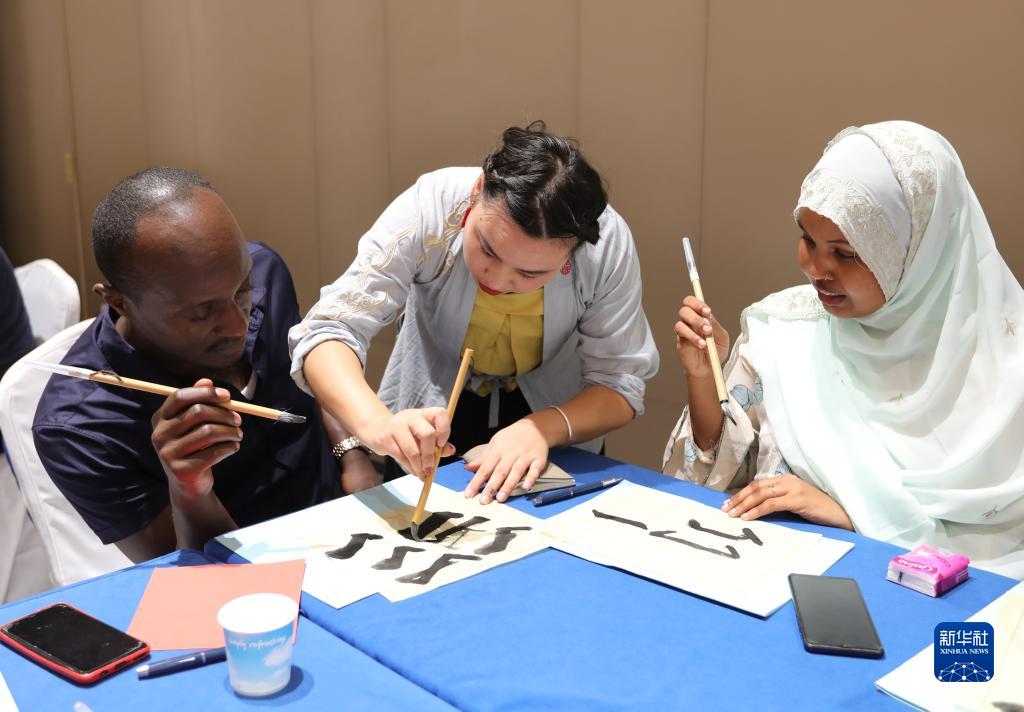 9月18日,在吉布提首都吉布提市,吉布提孔子学院老师教学员写毛笔字。