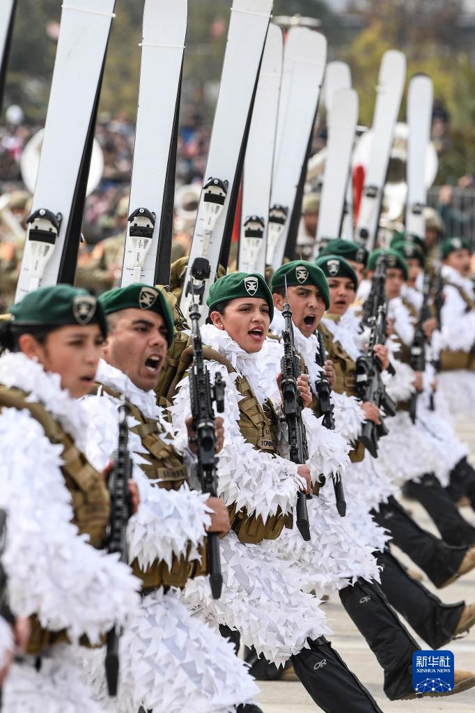 9月19日,在智利首都圣地亚哥,陆军山地师士兵在阅兵式上列队行进。