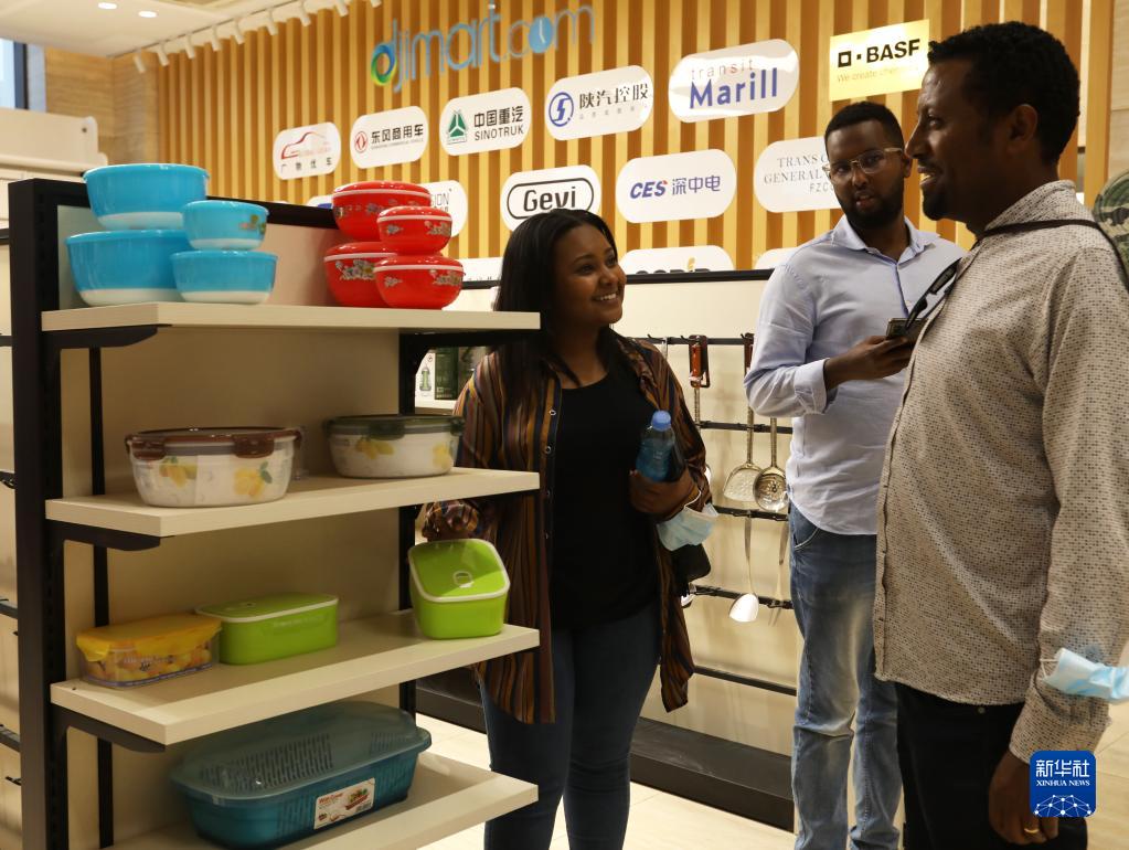 9月14日,在吉布提国际自贸区,非洲创业青年在跨境电商平台商品展示区交流。