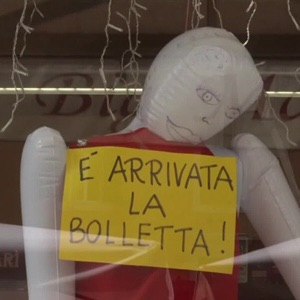 身披红色围裙,透明胶带从喉咙处勒过,胸前贴着黄色纸条“账单来了”——这是一个被悬挂在玻璃窗前的充气人偶。而如此行为艺术般的无奈之举,是能源危机之下,意大利一家咖啡馆的“无声抗议”。