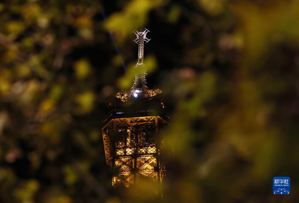 这是9月22日拍摄的亮灯的法国巴黎地标性建筑——埃菲尔铁塔。