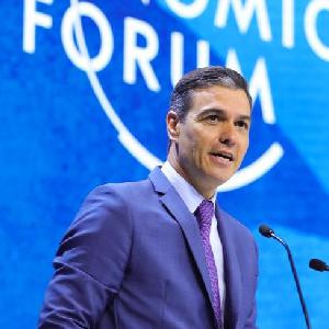 这是2022年5月24日,在瑞士达沃斯,西班牙首相桑切斯出席世界经济论坛年会时致辞。
