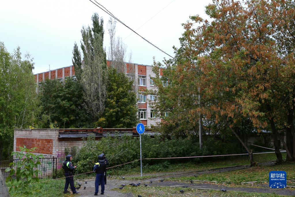 9月26日,在俄罗斯伊热夫斯克,安全人员在案发现场附近警戒。