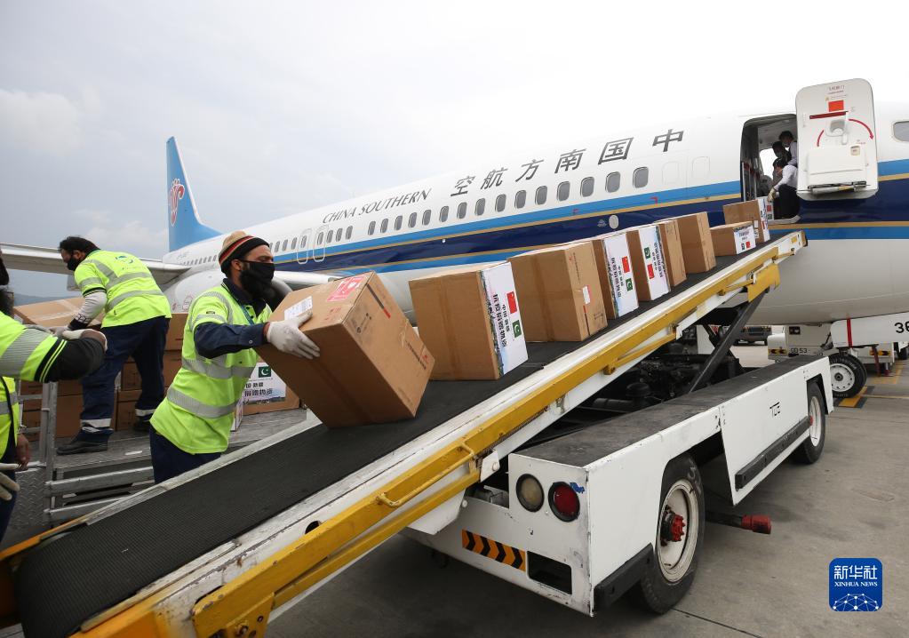 2020年3月28日,在巴基斯坦伊斯兰堡国际机场,工作人员卸载中国捐赠的医疗救治物资。新华社记者 刘天 摄