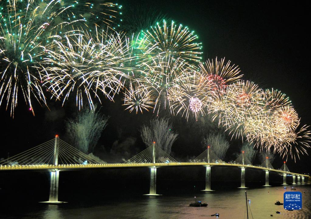 这是2022年7月26日在克罗地亚科马尔纳拍摄的由中企承建的佩列沙茨大桥通车仪式上的焰火表演。新华社记者 李学军 摄