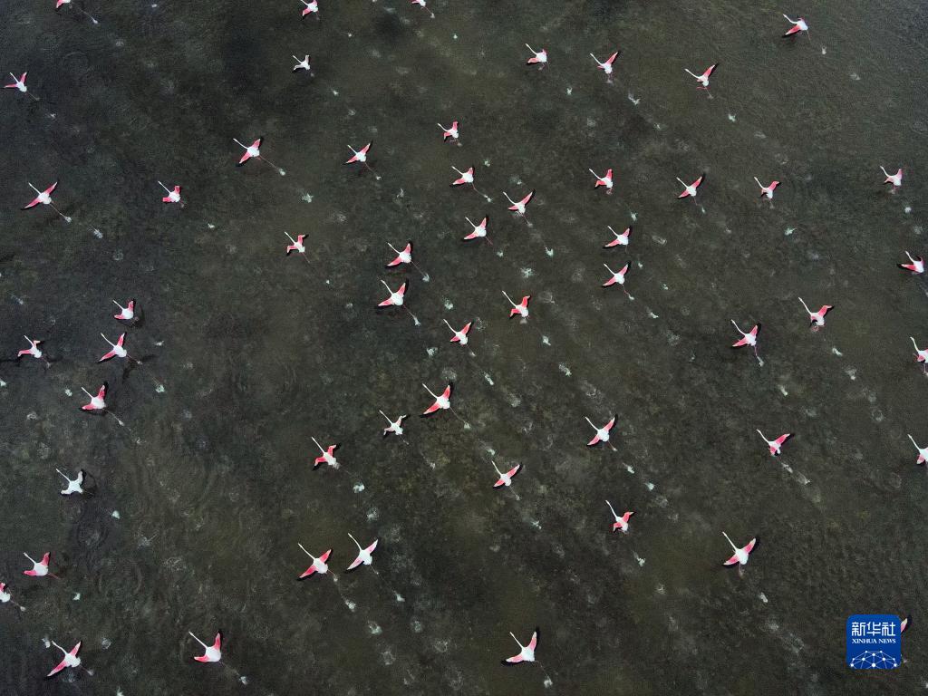 这是9月28日在土耳其首都安卡拉航拍的在湖面上飞翔的火烈鸟。