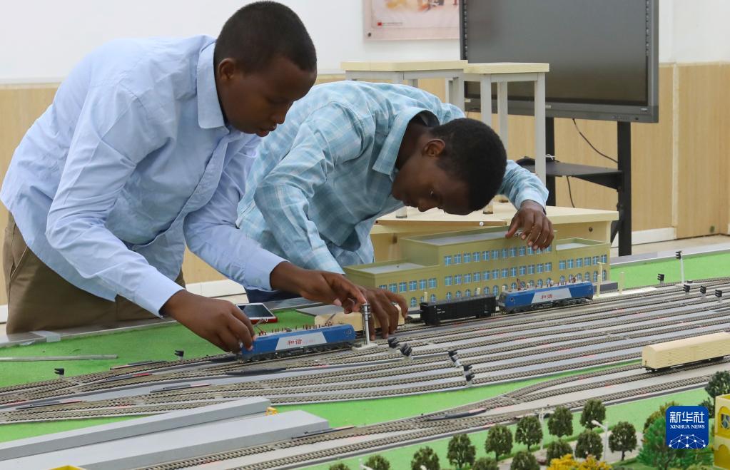 9月19日,在位于吉布提首都吉布提市的吉布提工商学校,学生在鲁班工坊铁道运营沙盘教学区学习。