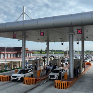 10月1日,车辆驶过柬埔寨金港高速公路金边站。新华社发(金港高速供图)
