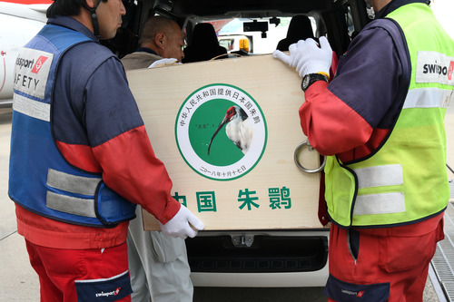 2018年10月17日,中国向日本提供的朱鹮抵达日本千叶县成田机场。 新华社记者华义摄