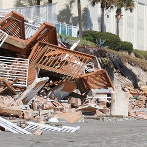 10月3日,在美国佛罗里达州代托纳比奇海滩,人们查看遭飓风“伊恩”损毁的设施。